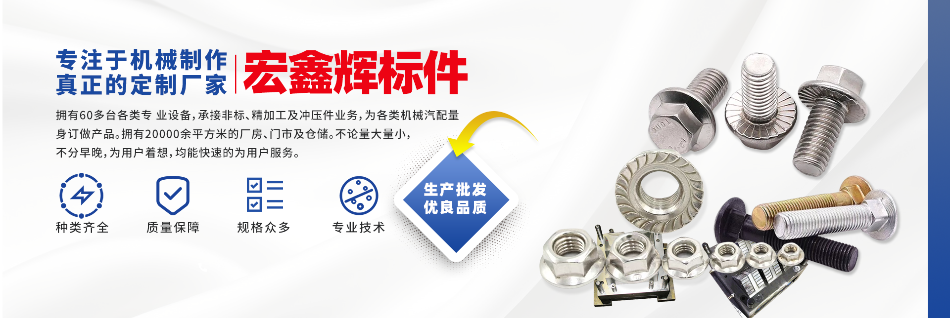 四川宏鑫輝標(biāo)準(zhǔn)件制造有限公司下設(shè):南充市宏輝機械制造有限公司,南充市聚宏機電設(shè)備有限公司,公司始建于1994年。為了拓展市場,降低成本,本公司于2007年、2020年分別在南充、 成都、重慶創(chuàng)建了生產(chǎn)基地。擁有60多臺各類專 業(yè)設(shè)備,承接非標(biāo)、精加工及沖壓件業(yè)務(wù),為各 類機械汽配量身訂做產(chǎn)品。擁有20000余平方米的廠房、門市及倉儲。公司以誠信為本,竭誠為廣大客戶提供服務(wù)。不論量大量小,不分早晚,為用戶著想,均能快速的為用戶服務(wù)。 公司所生產(chǎn)及代理的產(chǎn)品為業(yè)界人士公認的國內(nèi)、國際優(yōu)等品牌。在產(chǎn)品性能與質(zhì)量